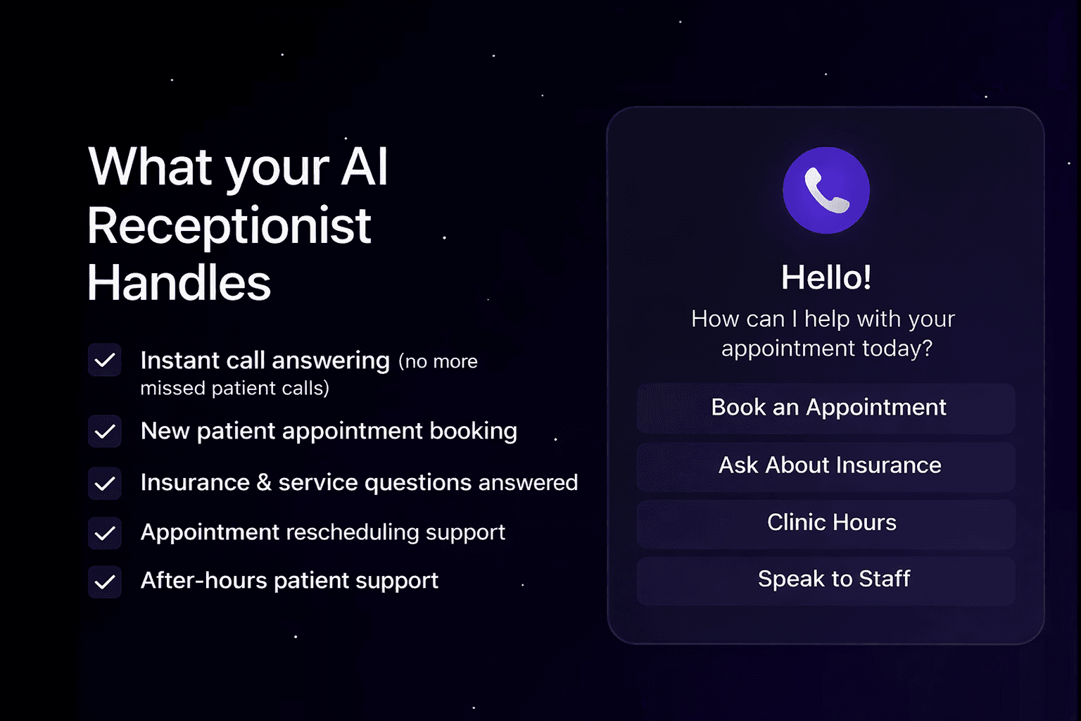 Your AI Receptionist answers calls instantly, books appointments directly into your calendar, handles FAQs, follows up with missed callers, and qualifies new patients so your front desk can focus on care, not chaos.