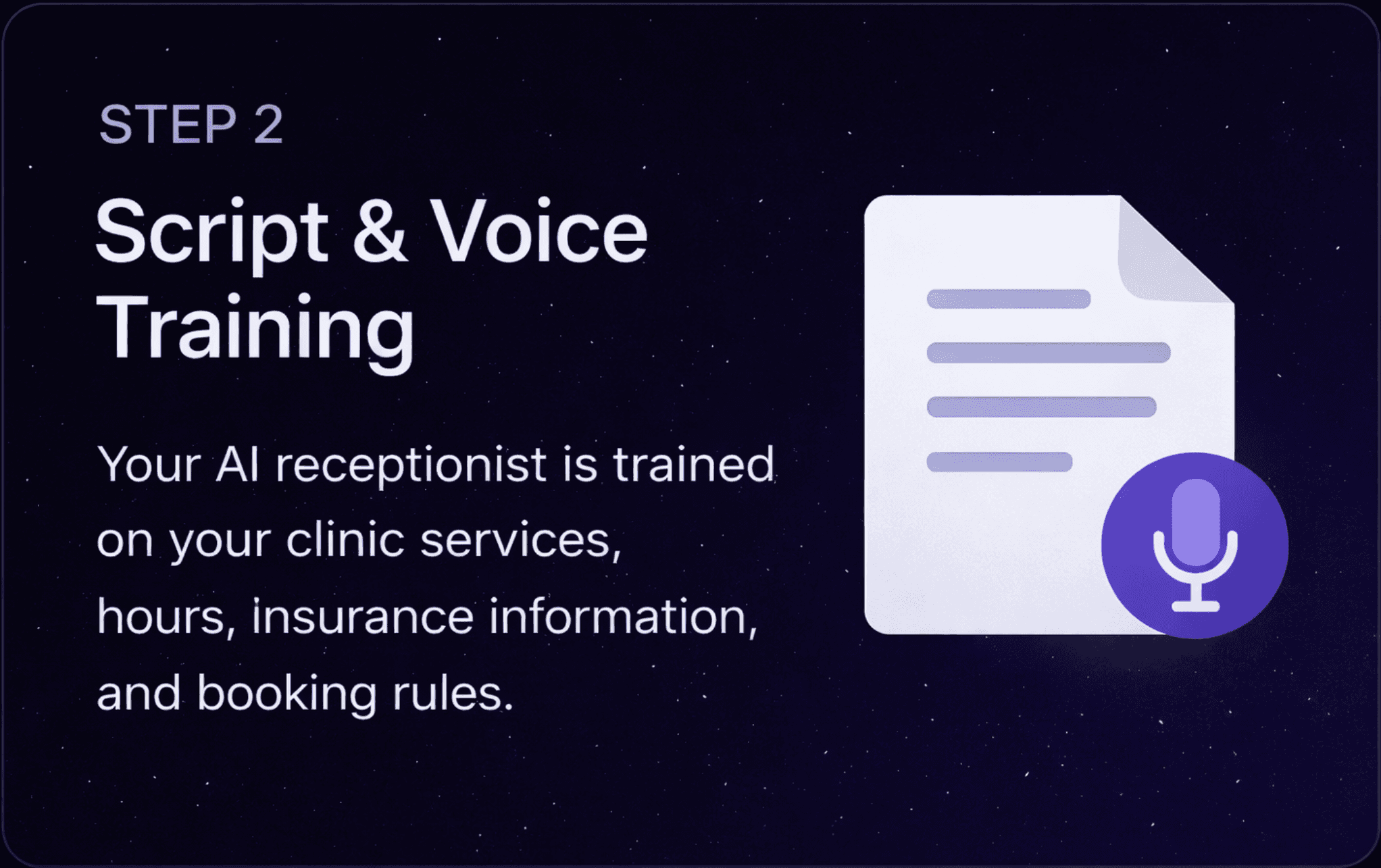 We train your AI receptionist using your clinic services, hours, insurance information, and appointment booking rules so it sounds like your staff.